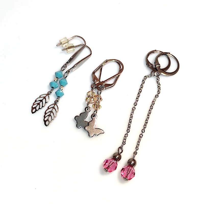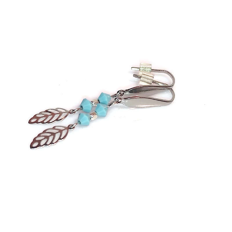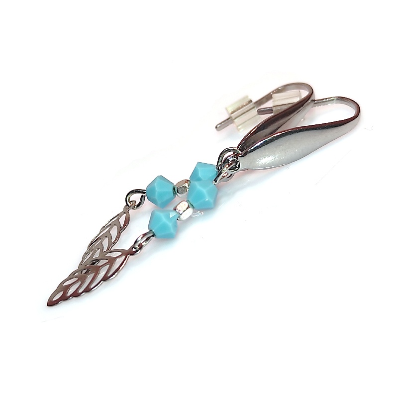 Náušnice jako blankytné nebe, modré korálky Swarovski v broušeném tvaru připomínají malé nebeské diamanty. Každý při pohybu zachytává světlo a mění se jako hladina kouzelného jezera. Pod nimi se houpají kovové lístky z nerezové oceli, tenké a pevné jako samotná lesní magie. Nerezová ocel je věčná – nevadí jí čas ani příběhy, které si odneseš na svých cestách.