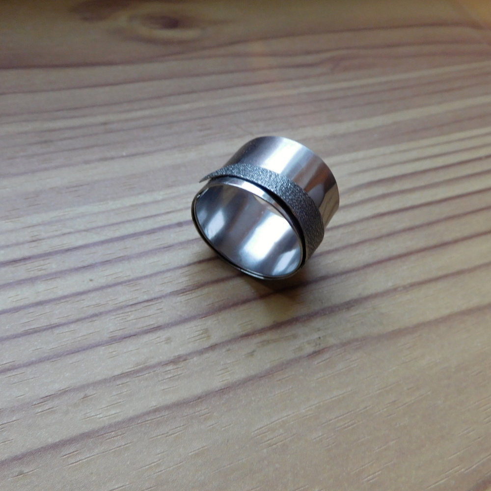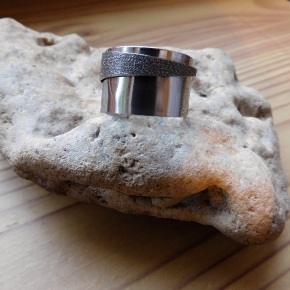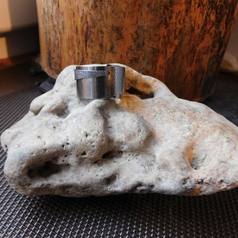 Originální širší pevný nerezový prsten, tepání na tomto prstenu vytváří jemný vzorek.