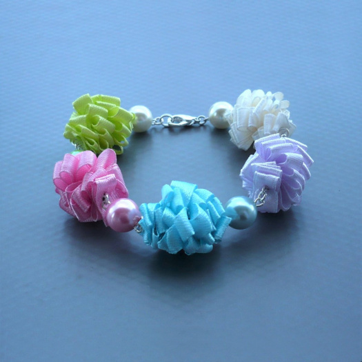 Náramek je vyrobený z něžně barevných voskovaných perliček a ve stejné barvě je použit i látkový materiál, který je kaskádovitě seskupen.
