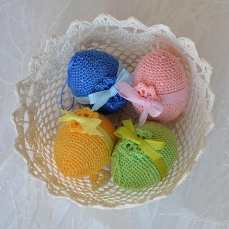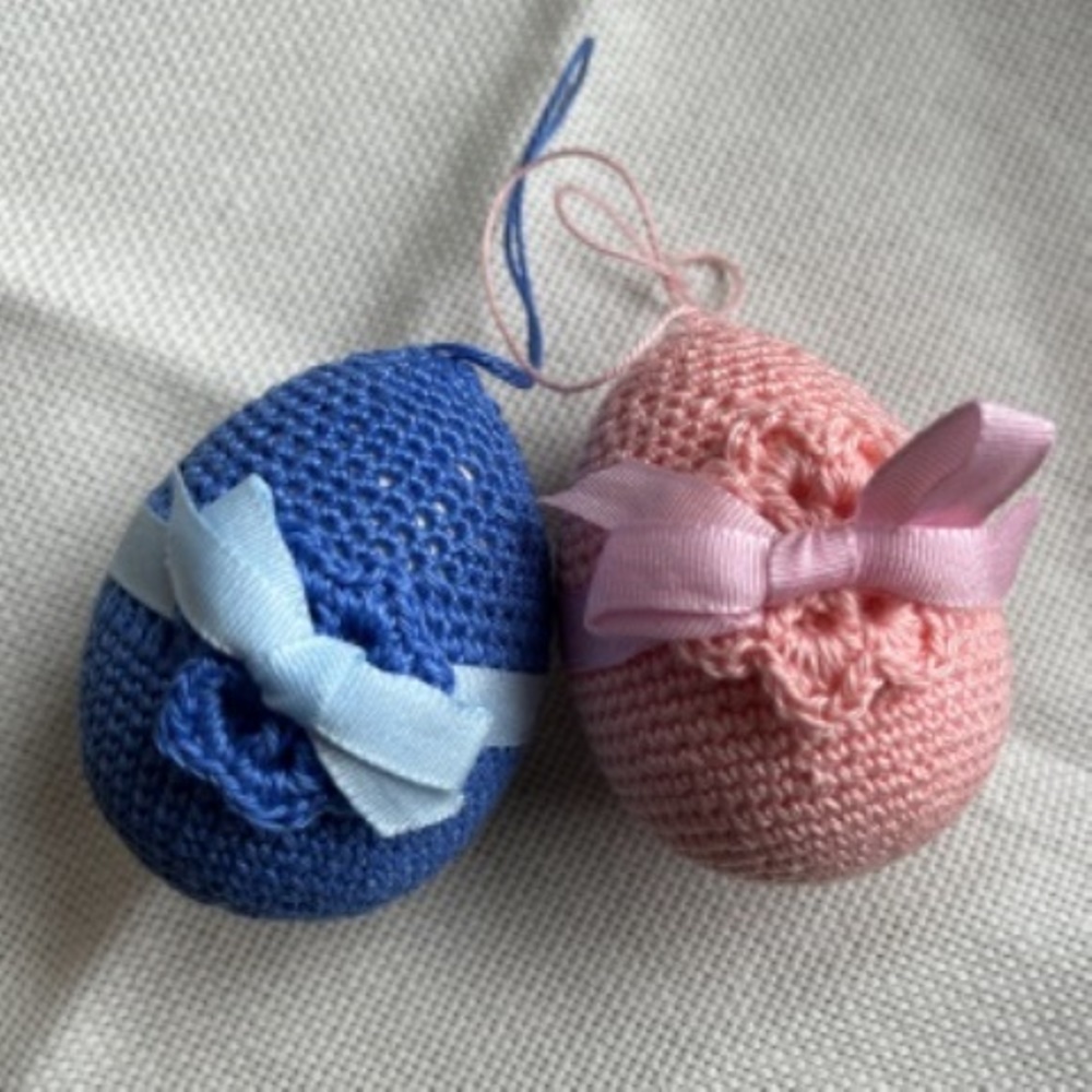 Háčkované kraslice na vatovém vajíčku - bavlněná příze růžová a modrá.