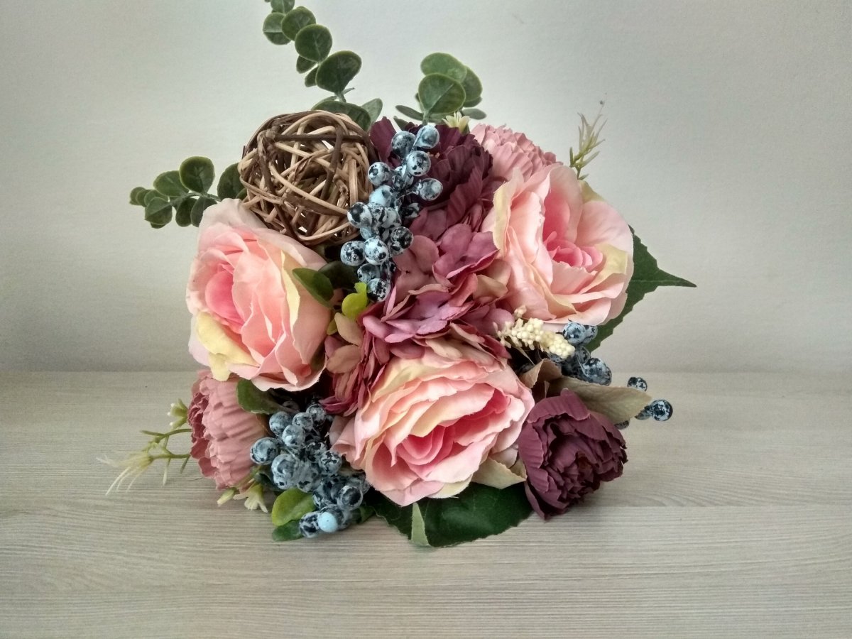 Kytice z umělých květin v jemných odstínech růžové. Průměr kytice je přibližně 22 cm.