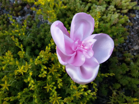 Čelenka pro malé parádnice.Něžně vypadající kvítek je vytvořený z lesklé látky doplněný pestíky.Šířka ozdobné pruženky je 1,5 cm.Kytička má rozměr cca 6,5 x 6,5 cm.Tato čelenka je velmi pohodlná nikde netlačí.
