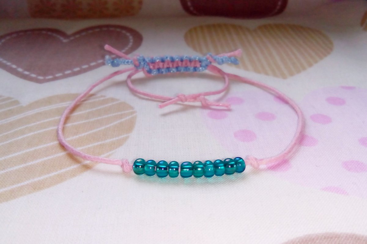 Nastavitelná velikost, zatahovací. Vyrobeno z textilní šňůrky se skleněnými korálky.