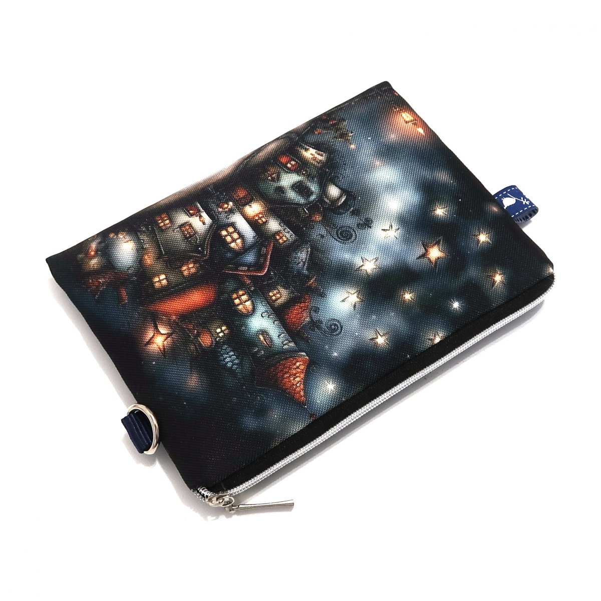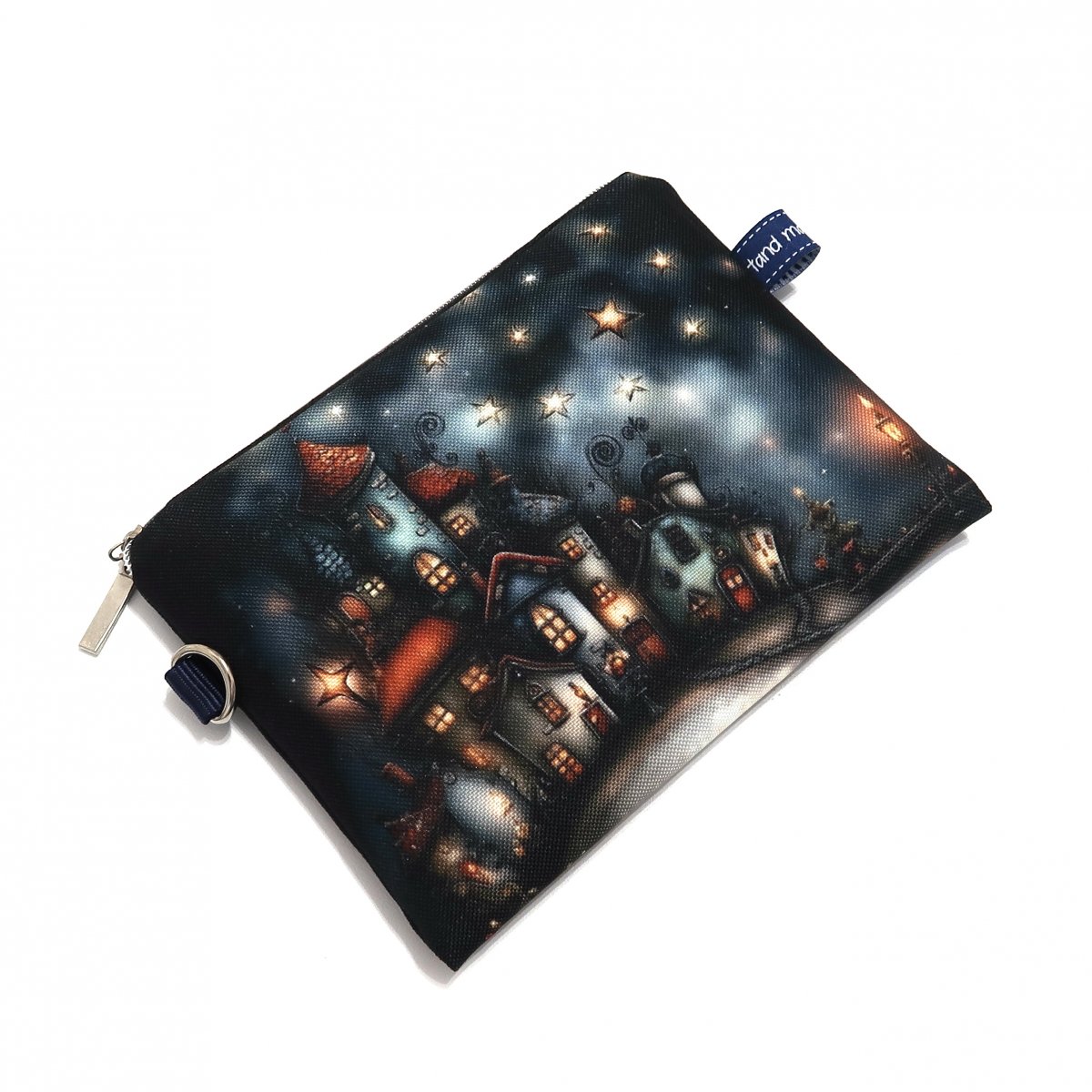 Na bocích kapsičky jsou všitá očka na které se dá připnout poutko na ruku nebo popruh na karabinky a tak se dá kapsička použít i jako malá crossbody nebo ledvinka.