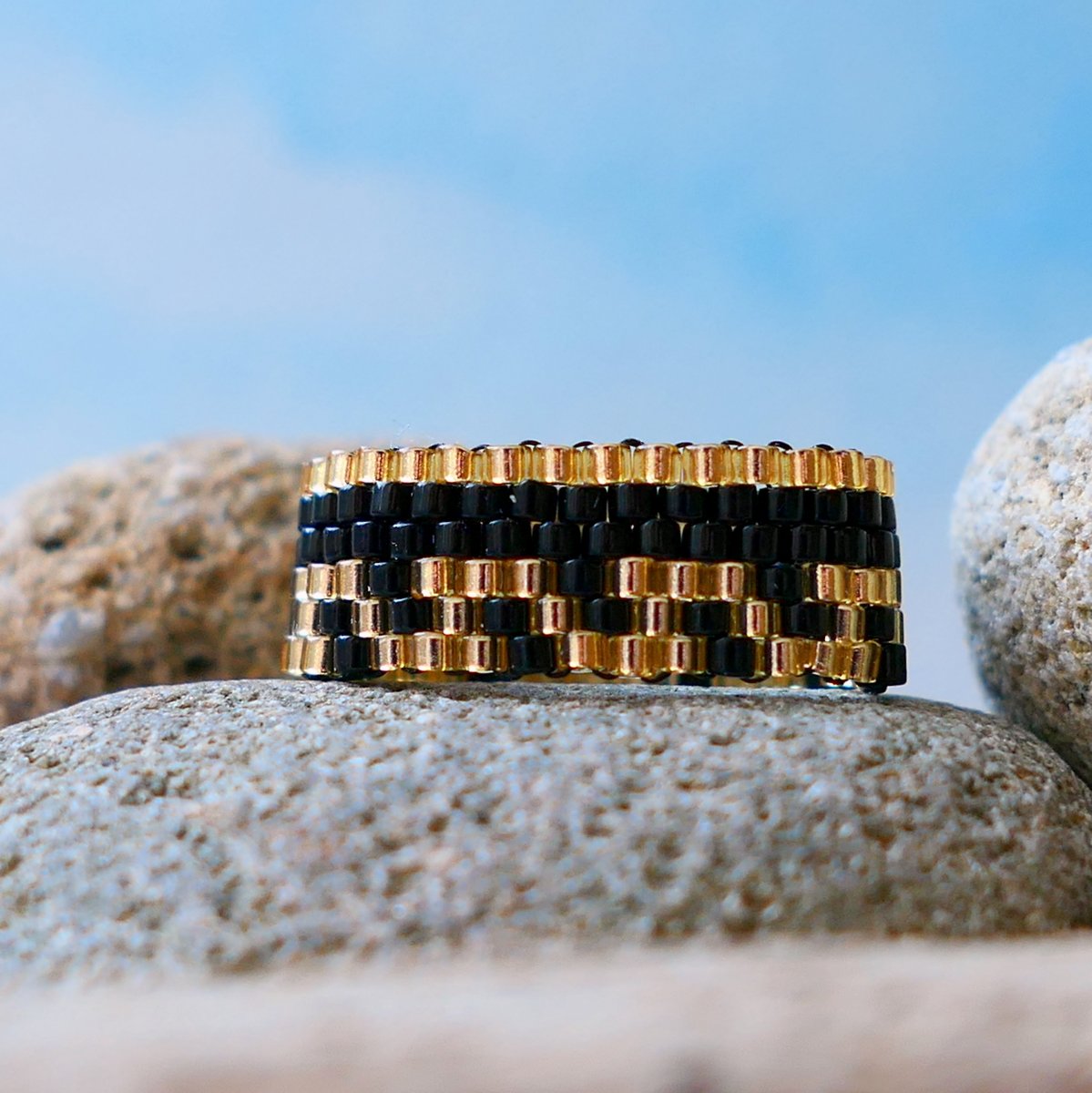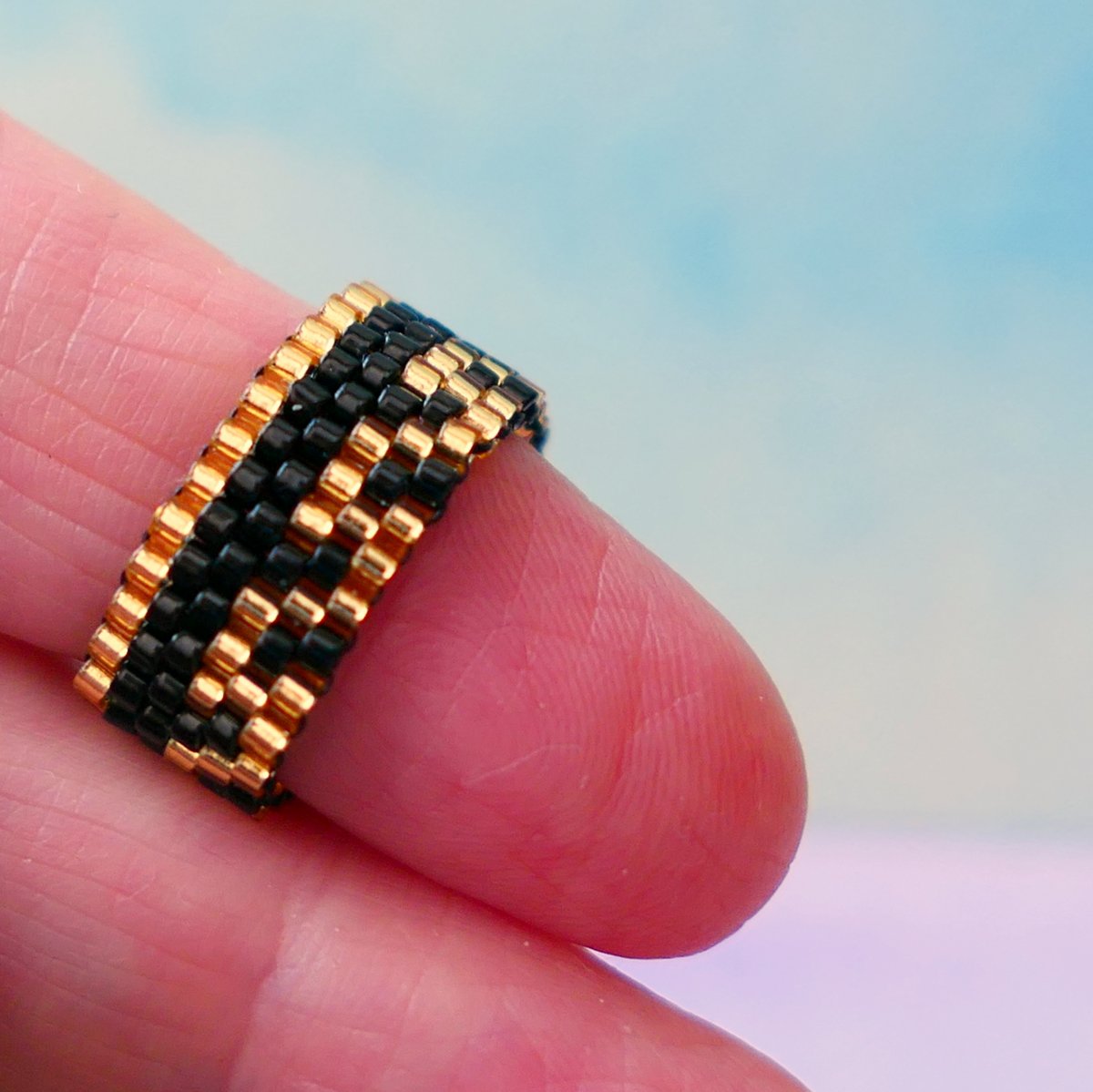 Šitý prsten z velmi kvalitních japonských korálků Miyuki v barvě černé a zlaté. Vzor je vytvořen zlatými korálky. Šířka prstenu 0,8 cm.