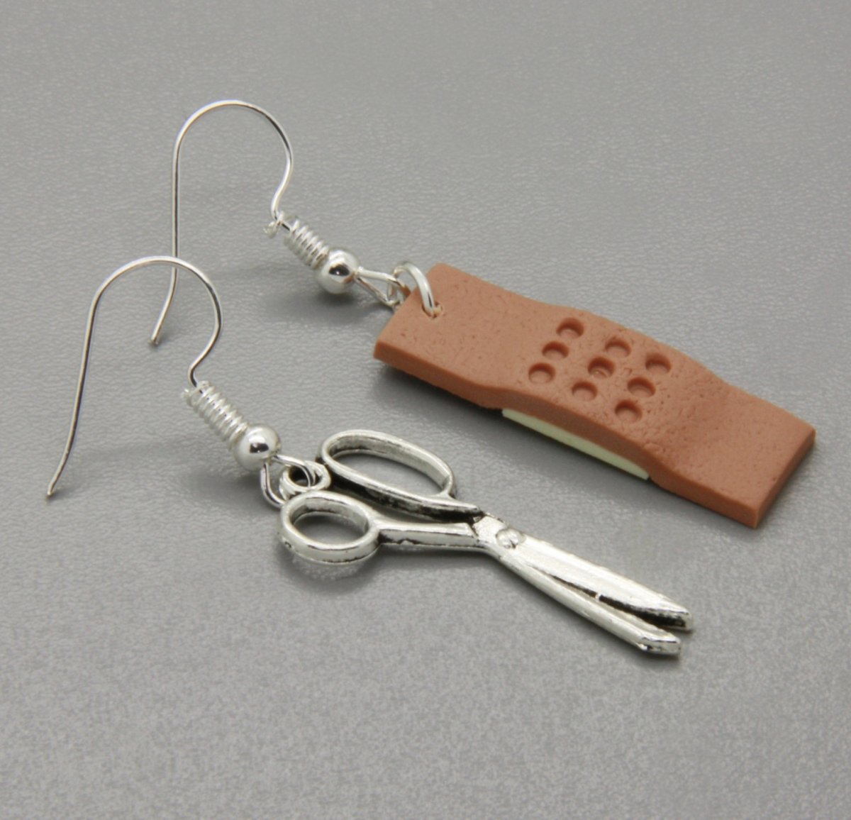 ručně modelovaný šperk z polymerové hmoty v podobě náplasti, doplněno o kovový komponent nůžek