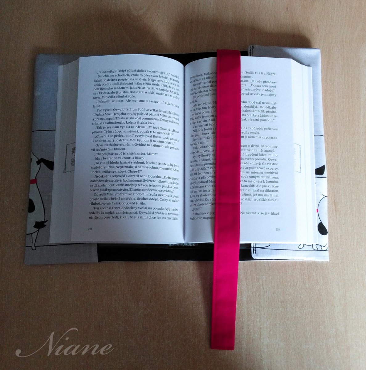 Po rozevření má obal na jedné straně kapsu a na druhé pruh, díky kterému si upravíte druhou stranu dle šířky knihy. Uprostřed obalu je všita látková záložka.