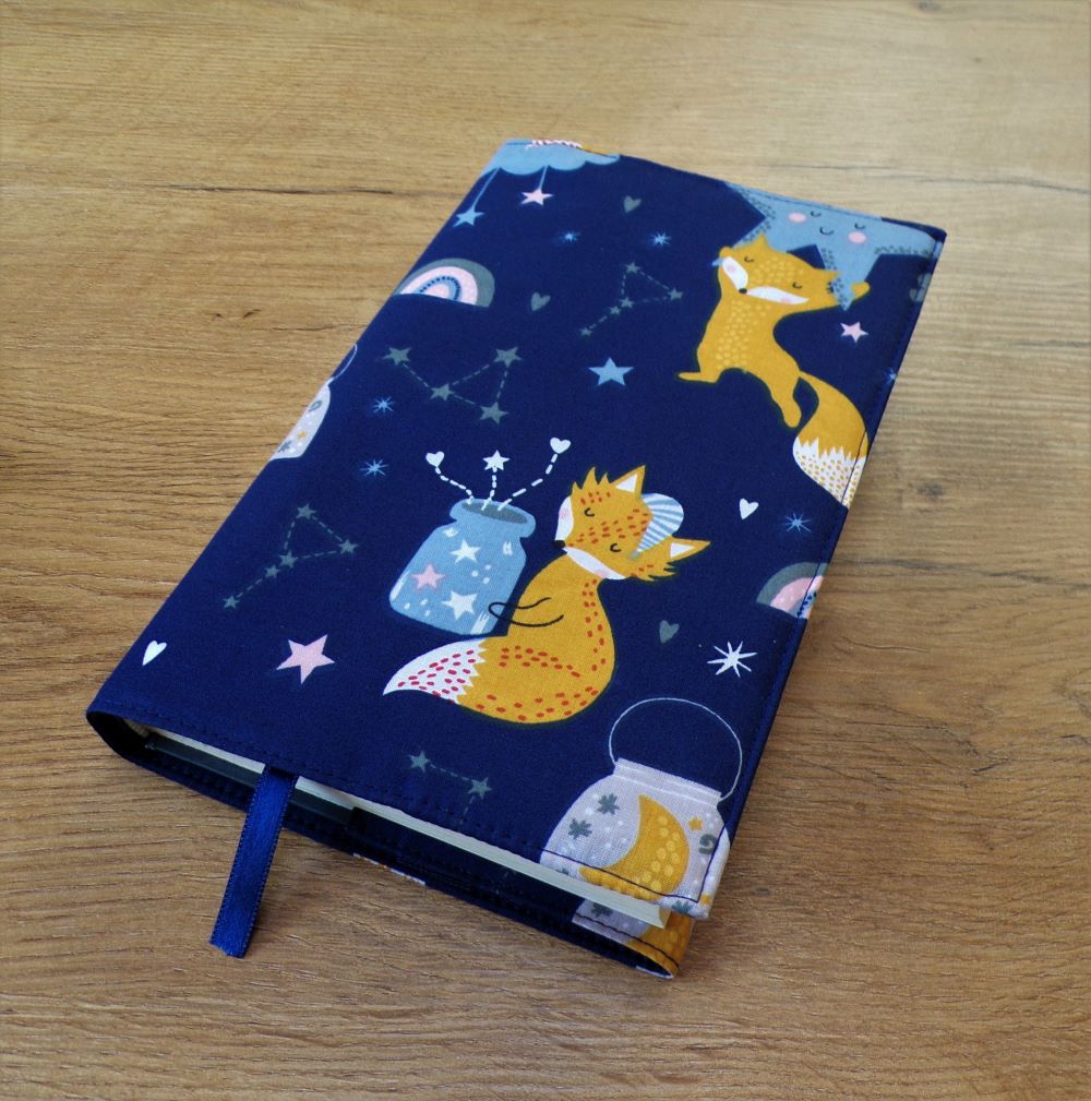 Obal na knihu ušitý z bavlněných látek, na vrchní straně tmavě modrá látka s liškami, spodní strana je z tmavě modré jednobarevné bavlny. Obal je vyztužený a po okraji prošitý pro zpevnění a dobře drží tvar, všitá záložka.
