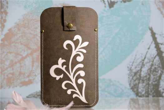 Pouzdro na mobilní telefon z pratelného papíru v barevné kombinaci bílá a hnědá .