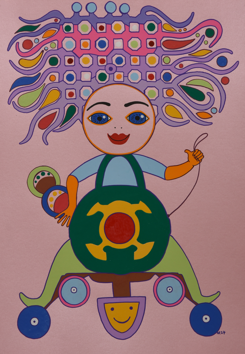 Akrylový fix na růžovém tvrdém grafickém papíru.