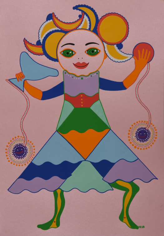 Akrylový fix na růžovém tvrdém grafickém papíru.