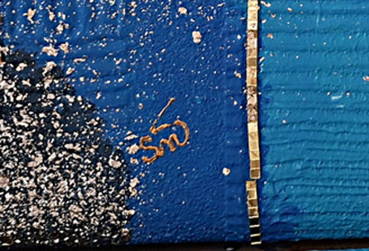 Abstraktní obraz „Zlatý odlesk v tyrkysu" v tónech modré, tyrkysové, bílé a s výraznými zlatými akcenty. Plastická struktura dodává malbě hloubku a luxusní efekt.Originál z ateliéru HelenArt.