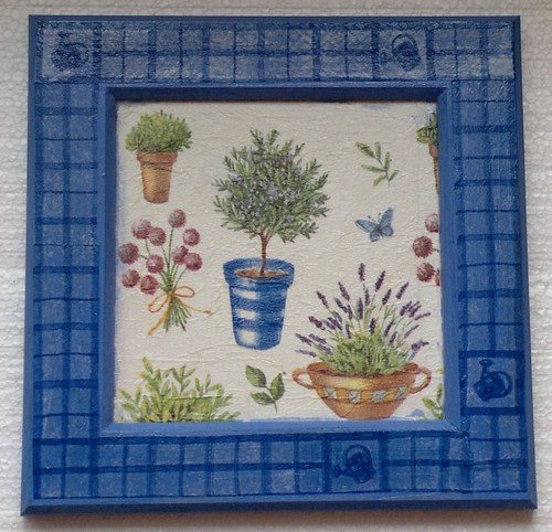 Obrázek je namalovaný akrylovými barvami a ozdobený technikou decoupage ubrouskem.