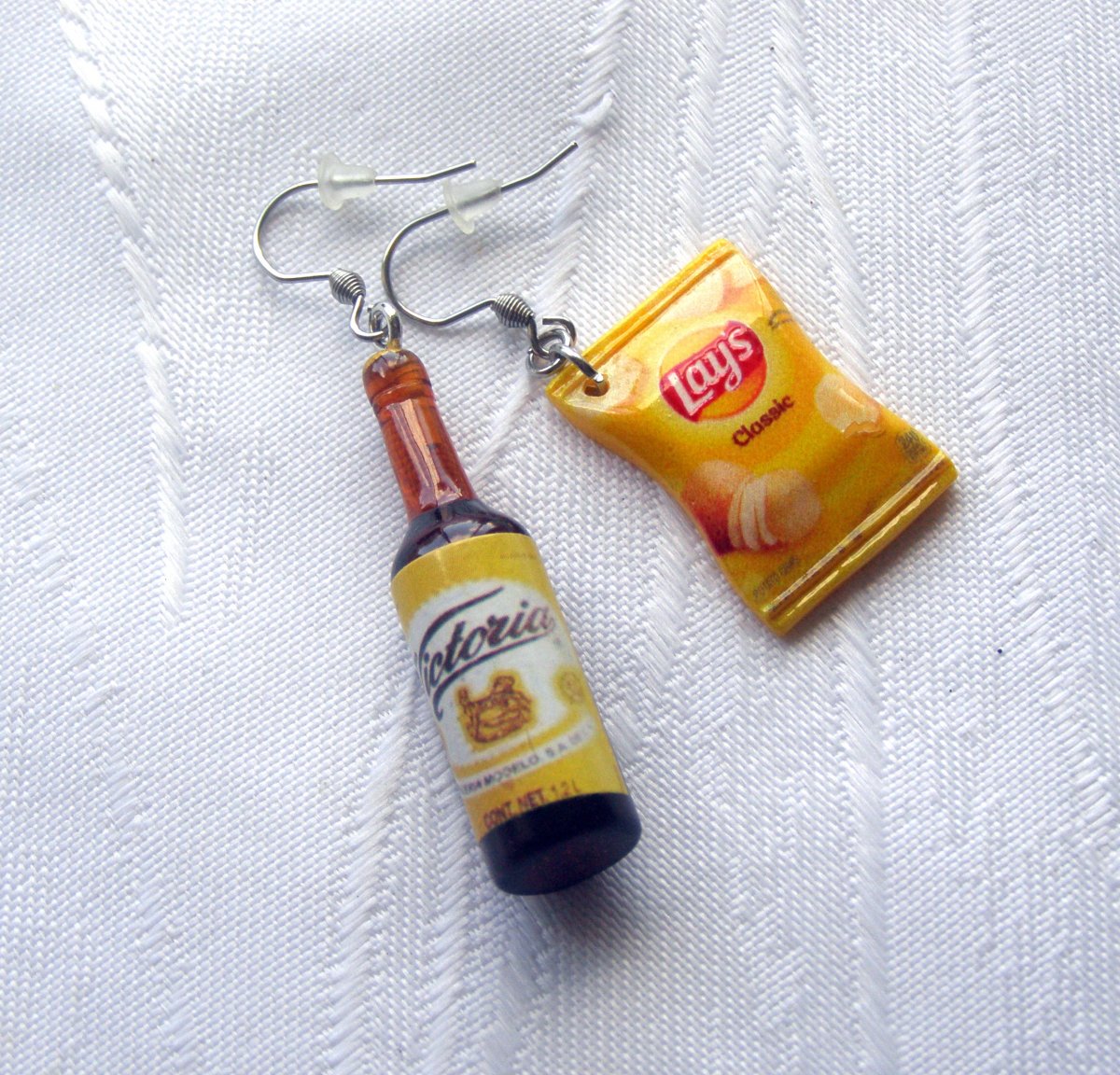 Náušnice z chir. oceli s přívěskem pivo a chipsy Lays.