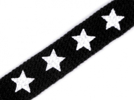 Plochá polyesterová šňůra s hvězdami je vhodná do tunýlků mikin, kalhot, bund, apod. Šíře šňůry je 10 mm. Uvedená cena je za 1 metr.