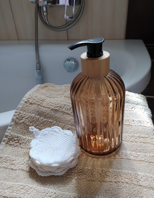 Háčkované odličovací tampónky z bavlněné příze. Tampónky jsou na opakované použití a jsou příjemné i při masáži obličeje. Každý tampónek má i ouško k zavěšení . Tampónky je možné prát v pračce, nejlépe je vložit do pytlíčku na jemné prádlo a prát na 60 °C.