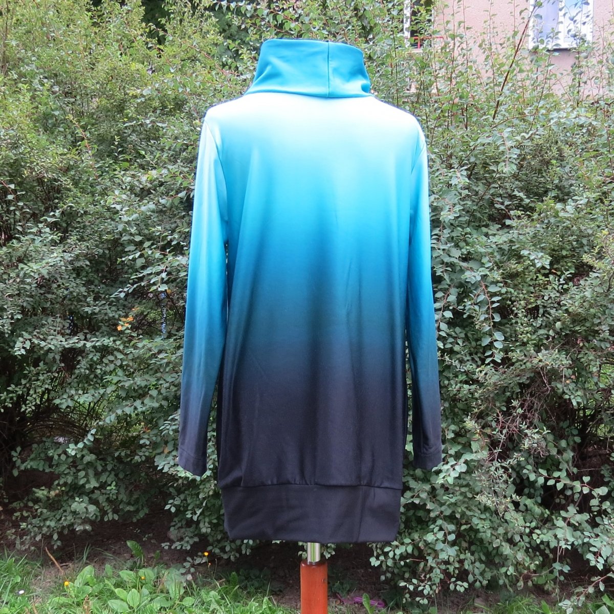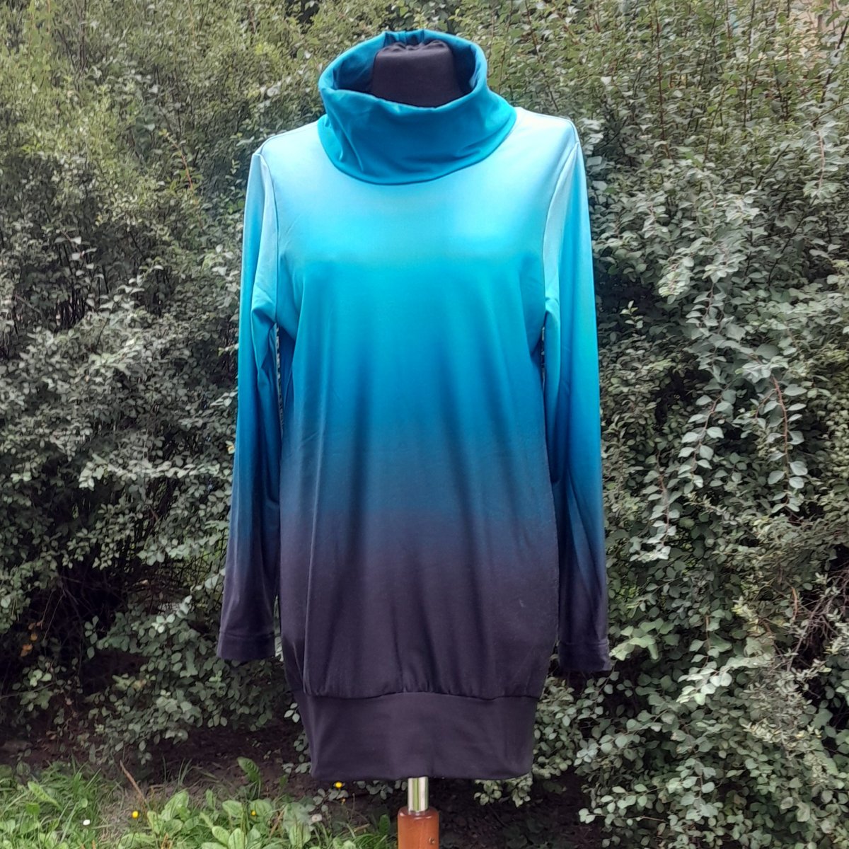 Mikinošaty z ombré úpletu. Vzor přechází od antracitové barvy dole přes zelenou až do modrozelené. Materiál je počesaný funkční úplet s nanočásticemi stříbra, který saje pot a brání zápachu. Z vnitřní strany je počesaný - má jemný chloupek - a je velmi příjemný na těle a hřejivý. U krku mají vysoký rolák, spodní okraj je stažený do manžety..