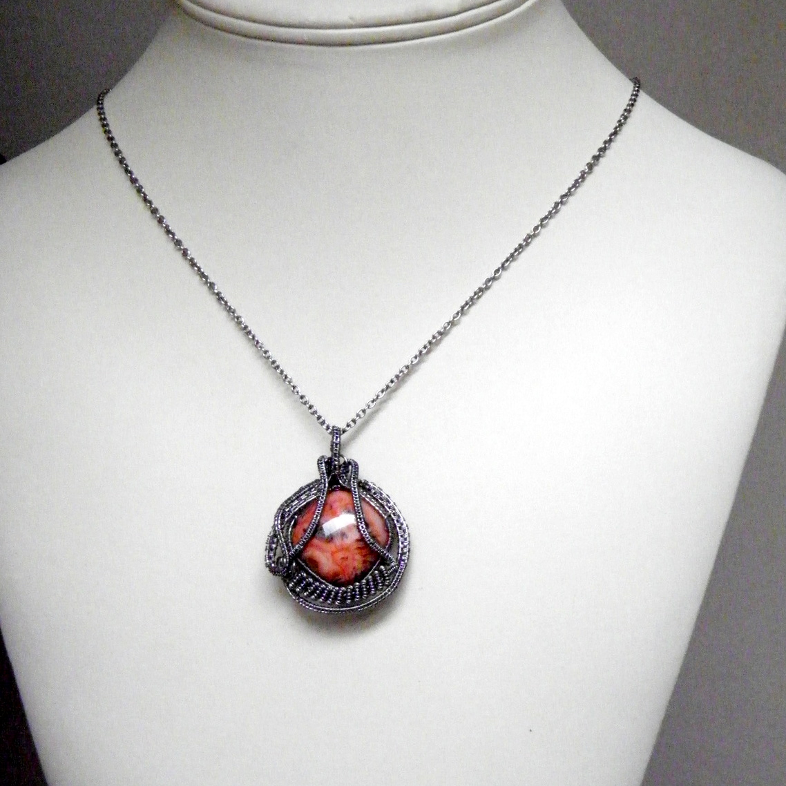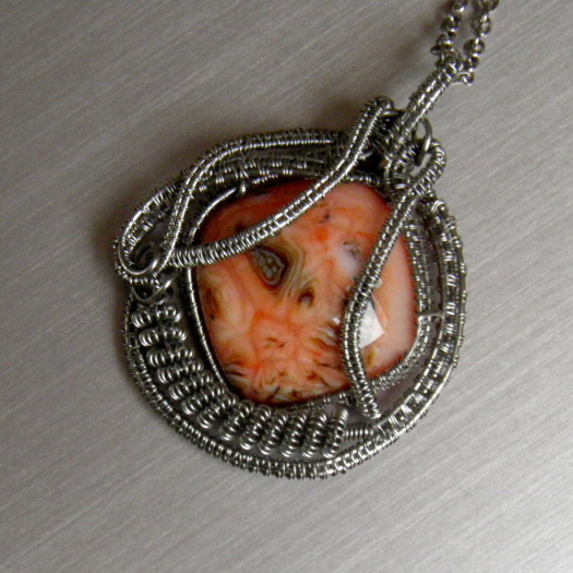 Přívěsek s vlastnoručně vyrobeným plastickým skleněným kabošonem. Kabošon byl vytvořený spékáním skla v elektrické peci. Je upevněný v opletu z drátků z nerezové oceli. Velikost přívěsku je 4 x 3 cm. Je zavěšený na řetízek z nerezu, dlouhý 46 cm. Vhodné prpo alergiky.