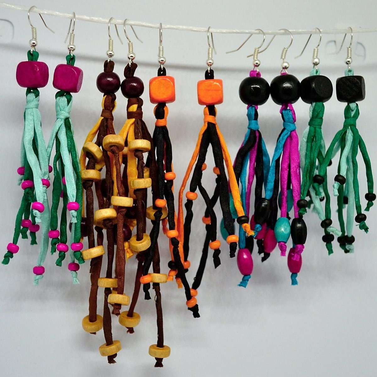 Náušnice vyrobené z vlastnoručně barvených hedvábných šňůrek (pongé 5) a dřevěných lakovaných korálků v oranžové a černé barvě