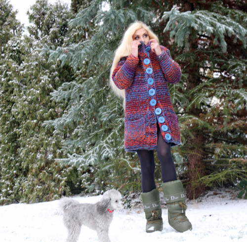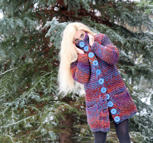Autorský ručně pletený velmi silný a teploučký svetr v konfekční velikosti L-XL, pletený z velmi příjemné efektní příze (dovoz SRN) v v zajímavé barevné kombinaci rezavé, modré a fialové. Na předních dílech jsou velké kapsy. Kapuca je zateplena plyšem ladícím k barvě svetru. Zapínání - velké ručně vyráběné knoflíky na předním dílu.