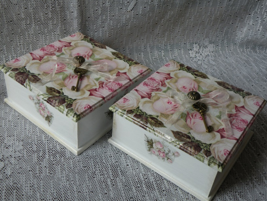 Romantická krabička s víkem z MDF zdobená motivem vintage růží, některé zvýrazněny 3d lakem, kovovou knobkou, mosazným klíčem, barvena, lakována