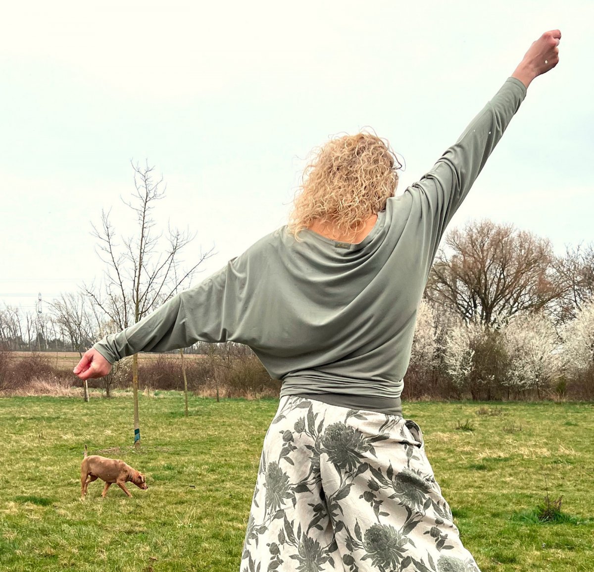 Volná tunika s lodičkovým výstřihem a netopýřimy rukávy z úpletu viskóza/elastan.