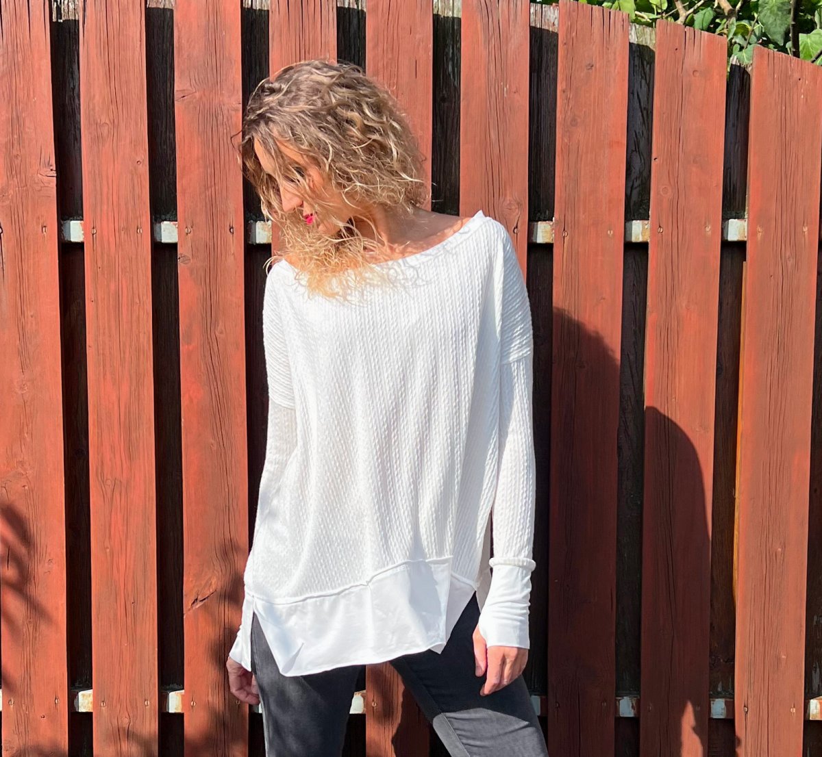 Volná tunika s lodičkovým výstřihem je ušitá ze směsového úpletu .
