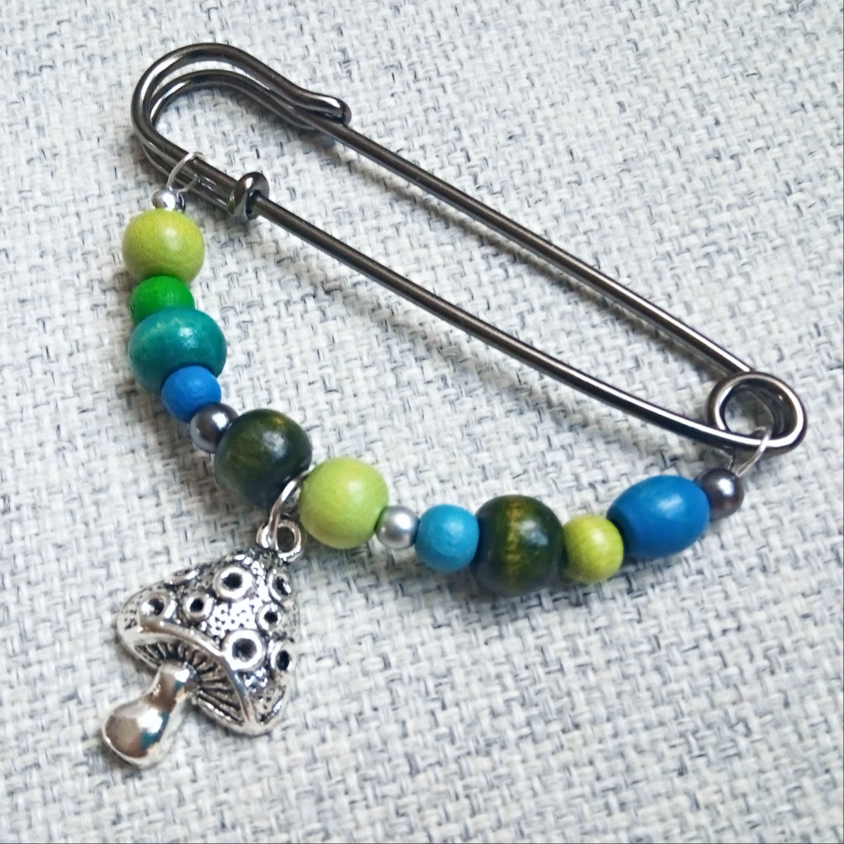 Špendlík má délku 7,5 cm, antracitovou barvu. Ozdobený je stříbrným přívěskem houbičky a dřevěnými a plastovými korálky v zelené, modré a stříbrné barvě.