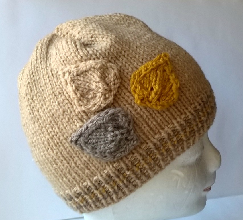 Ručně pletená hladká čepice ozdobená třemi našitými lístečky. Čepice má pružný lem s tenkými pružky. Materiál 100% akryl.