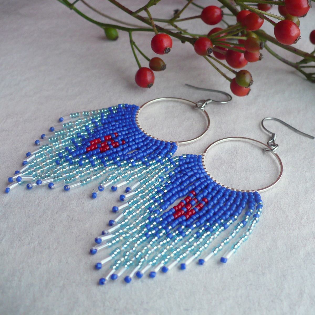 Dlouhé třásňové šité náušničky šířky 3 cm, zhotovené v nerez kruhu průměru 2,5 cm, zavěšené na otevřených háčcích z nerezu. S korálkovými třásněmi mají náušničky s kruhem bez háčků délku 7 cm.