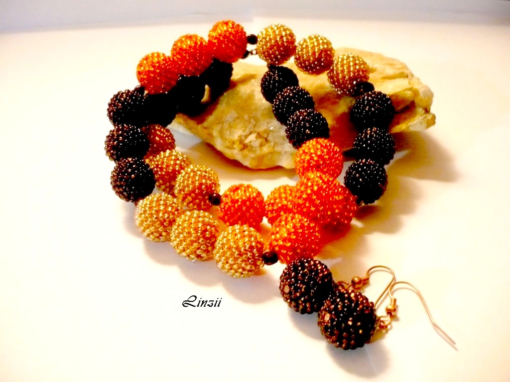 Luxusní náhrdelník z rokajlových korálků vytvořen technikou obšívání. V náhrdelníku je 30 jednotlivě obšívaných kuliček, ve kterých se skrývá dřevěný korálek. Průměr kuličky je 1,2 cm. Náhrdelník je doplněn bronzovými ohňovkami. Délka je 48 cm, je velmi příjemný na nošení a je návykový - struktura kuliček :). V ceně jsou také náušnice ve stejných barvách.