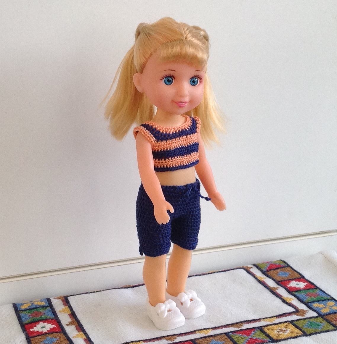 Šatičky jsou uháčkovány z tenké příze perlovky. Vzadu od výstřihu po pás je zapínání na suchý zip, proto se snadno oblékají. Tyto šatičky se hodí pro panenku s rozměry: šířka hrudníku 12 - 16 cm, délka sukénky 8 cm, celková délka šatiček je 14 cm.