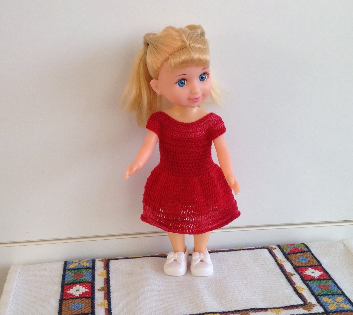 Šatičky jsou uháčkovány z tenké příze perlovky. Vzadu od výstřihu po pás je zapínání na suchý zip, proto se snadno oblékají. Tyto šatičky se hodí pro panenku s rozměry: šířka hrudníku 12 cm - 16 cm, délka sukénky 6 cm, celková délka šatiček je 12 cm.