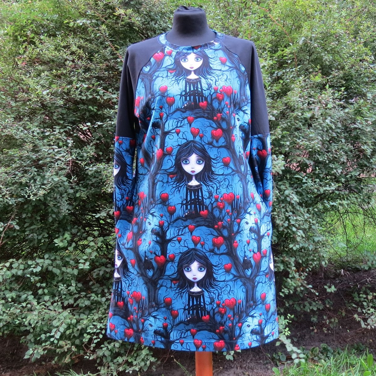 Rozměry: horní obvod = 102 cm, boky = 108 cm, délka rukávu od krku 65 cm, délka šatů 90 cm. Protože jde o úplet, povolí a přizpůsobí se i postavě s o trochu většími rozměry. Dobře padnou ženám, které nosí konfekční velikost 44.