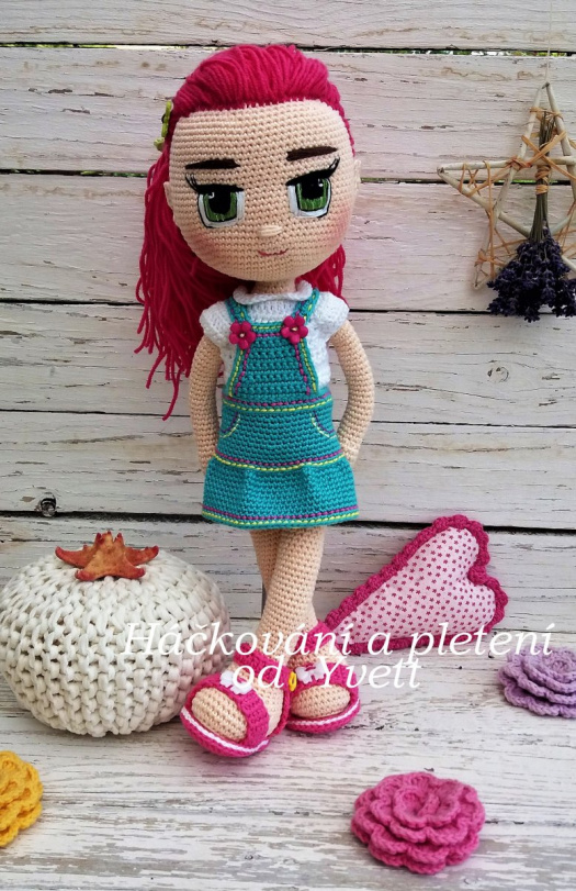 Panenka je háčkovaná v jednom kuse, takže se vyhnete sešívání jednotlivých dílů. Šatičky jsou háčkované zvlášť.