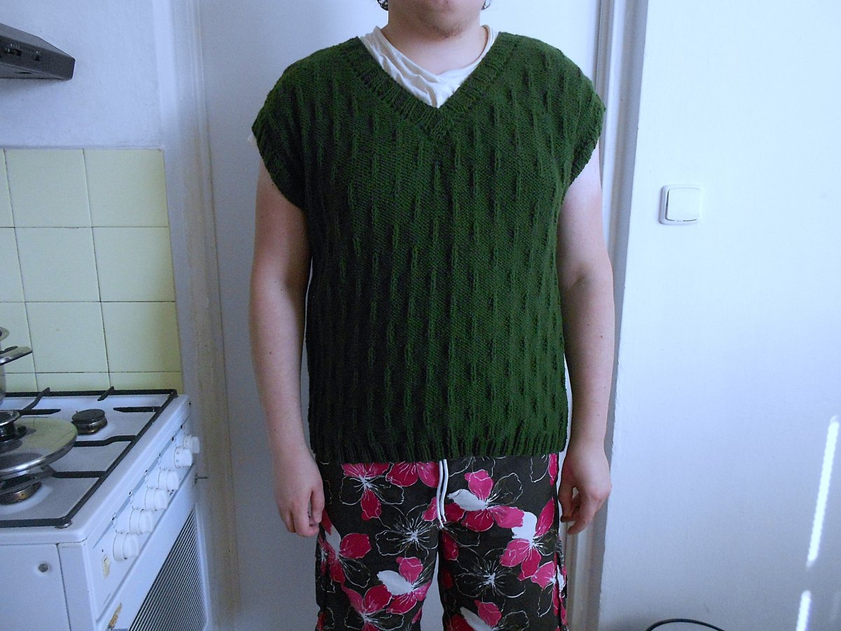 Ručně pletená, pánská ( možno i dámská) vesta, khaki. Velikost S,M. Délka 66cm, šířka 55cm. 30% vlna, 70% akryl. Doporučuji ruční praní a sušit volně položené. Foceno na velikosti L.