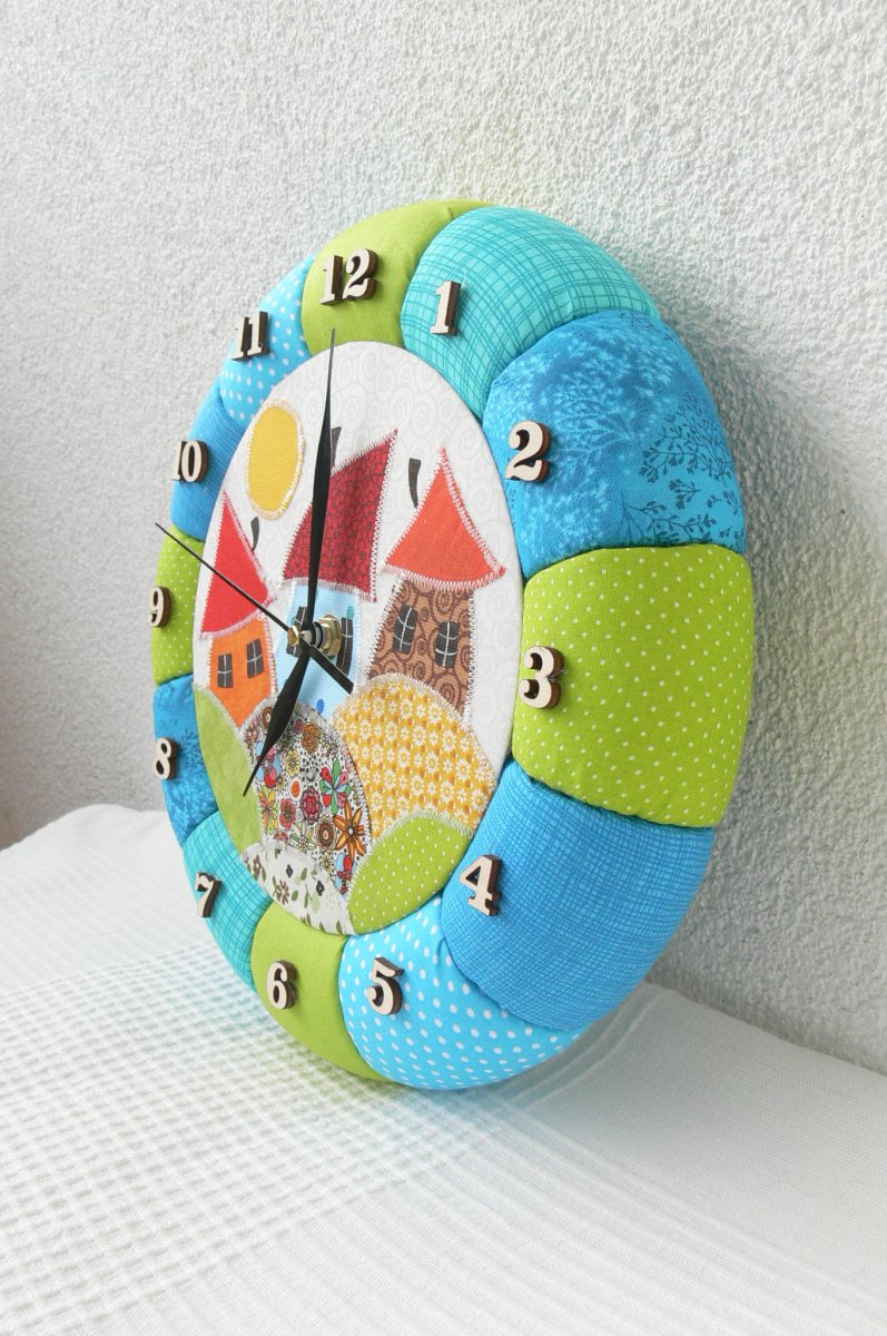 Originální patchworkové hodiny do dětského pokoje. Průměr hodin je 28cm a tloušťka 6cm. Tyto hodiny mají plynulý chod strojku, tudíž je děti v pokoji vůbec neuslyší a nebudou je rušit při spánku. Hodinový strojek chodí na 1ks tužkové baterie.