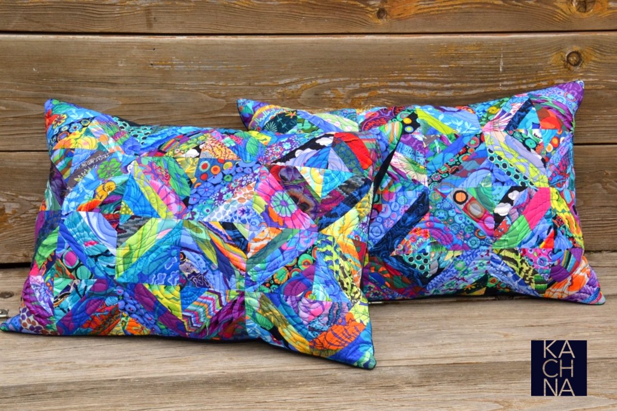 Polštář šitý patchworkovou technikou s geometrickým motivem pestrobarevných látek převážně od návrháře Kaffe Fasseta.