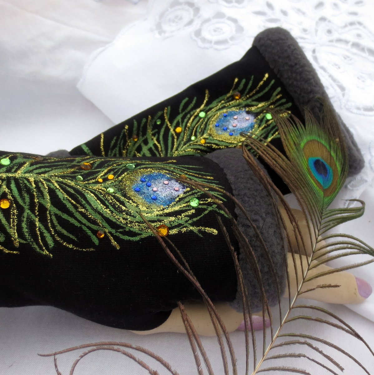 Hřbet rukavic je ručně malovaný motivem pavího peří, ve třpytivých barvách a spoustou třpytivých kamínků