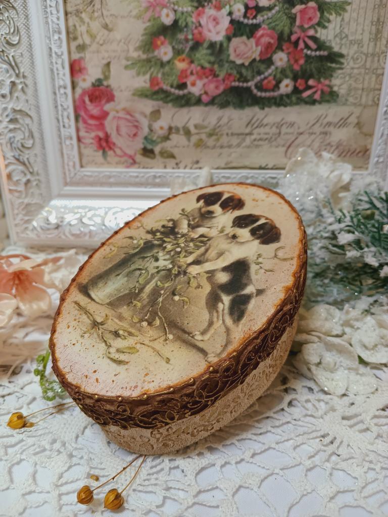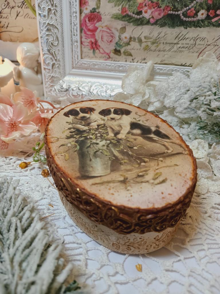 Dřevěná krabička s motivem pejsků a květináčem se jmelím ve vánočním nádechu. Víko krabičky je zevnitř dekorované motivem andílka zvonícího u dveří. Okolo víka a spodního dílu, je reliéfní bordura, lehce přepatinovaná hnědou barvou a zlatavým voskem.