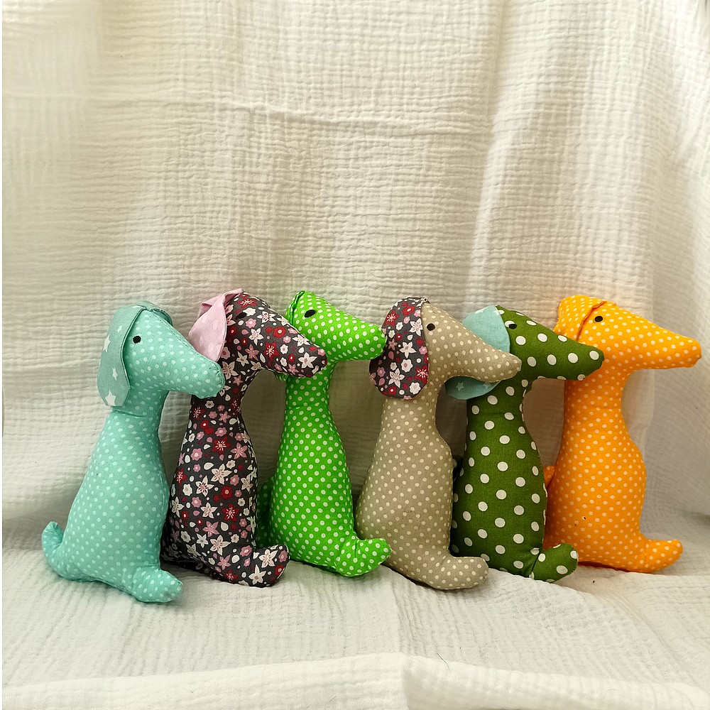 Pejsek je ušitý ze 100 % bavlněné, české látky, plněný dutým vláknem.