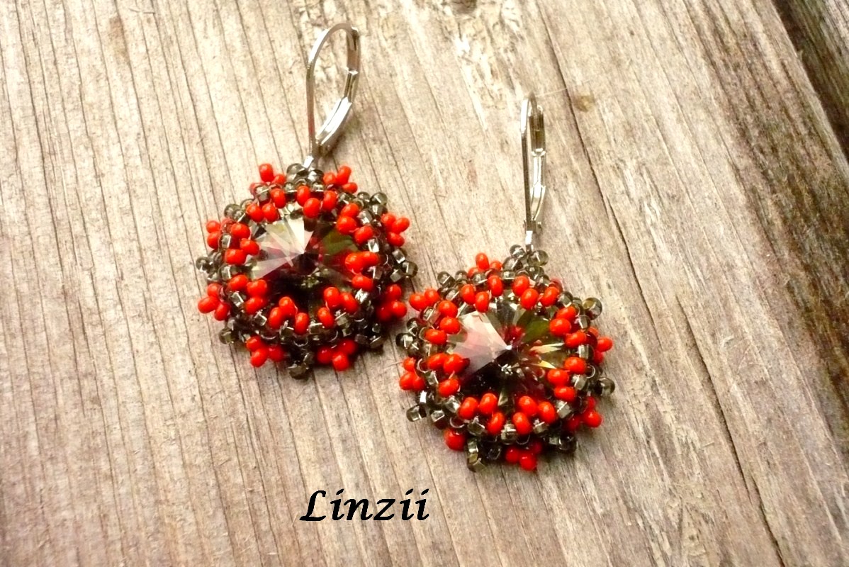 Ručně šité náušnice z kvalitního rokajlu Preciosa. Uprostřed je šedostříbrný kamínek Swarovski (Black Diamond). Zadní strana náušnic je také obšita korálky, zavěšeno na platinovém komponentu z obecného kovu. Velikost 2,3 cm bez háčku. Použity barvy korálků stříbrná lesklá a červená. Vyfocena i zadní strana. Náušničky jsou lehké.