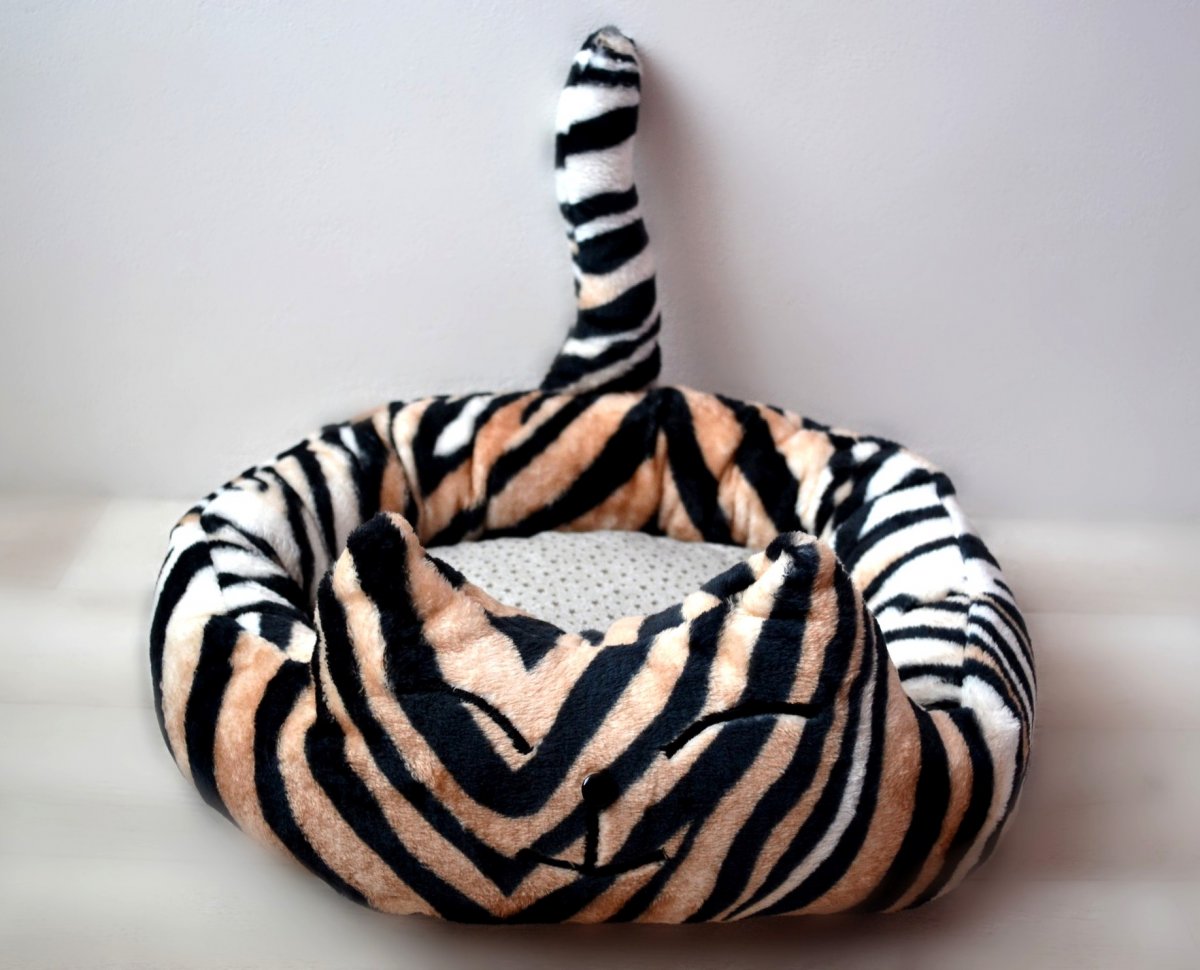 Tygrovaný pelíšek s polštářkem pro malé tygříky. Pelíšek je vhodný pro koťátka nebo menší plemena.