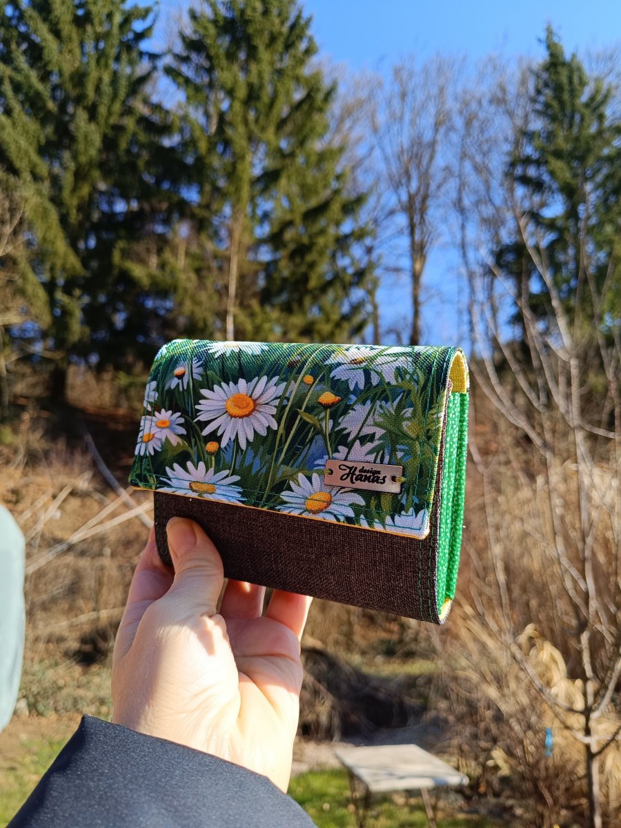 Peněženka, která vznikla z kombinace potahové látky a kočárkoviny, je vyztužená, takže si dlouho udrží svůj tvar i pěkný vzhled.