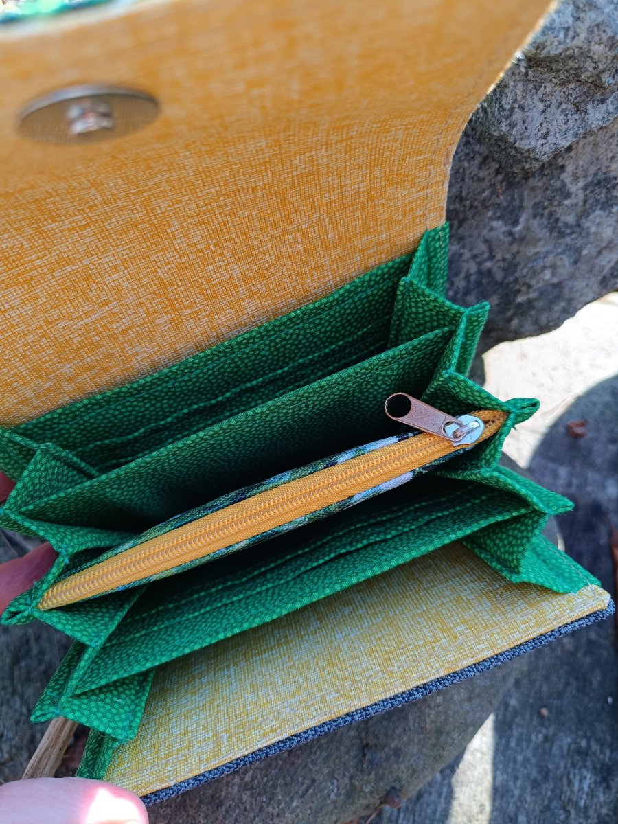 Vnitřní prostor je chytře rozdělený – najdeš tu dvě přepážky, zipovou kapsičku na drobné a zadní přepážku na karty.