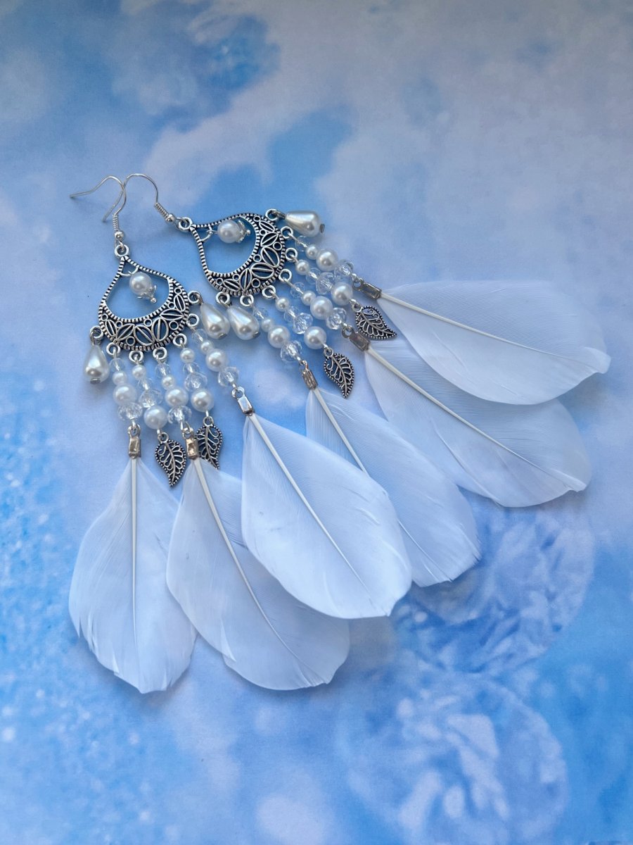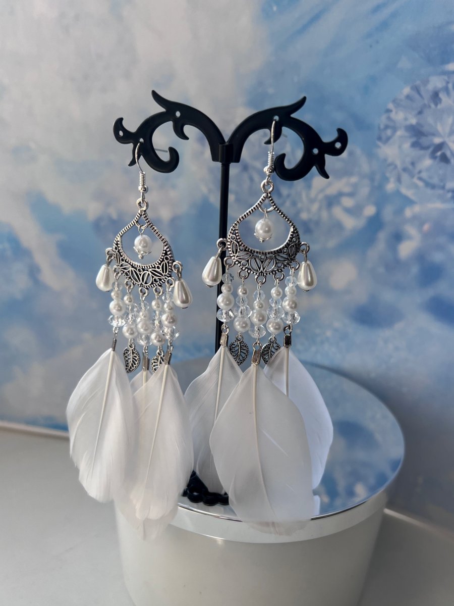 Nepřehlédnutelné "boho" náušnice s bílými peříčky, perlovými korálkami a kovovými komponenty v barvě stříbra. Délka od háčku 12 cm. Háček, ramínko a komponenty v barvě stříbra - běžný kov, gumové zarážky.