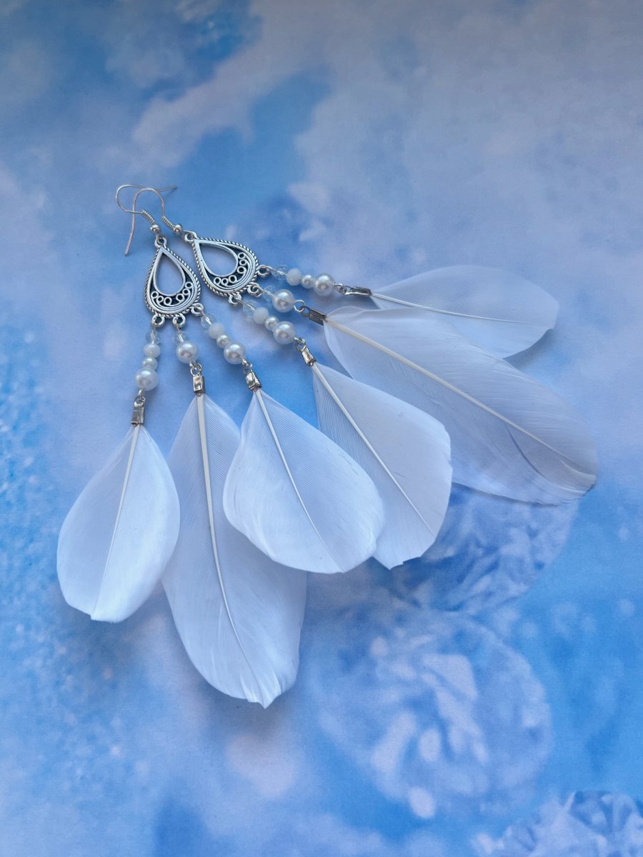 Nepřehlédnutelné "boho" náušnice s bílými peříčky, perlovými korálkami a kovovými komponenty v barvě stříbra. Délka od háčku 12 cm. Háček, ramínko a komponenty v barvě stříbra - běžný kov, gumové zarážky.