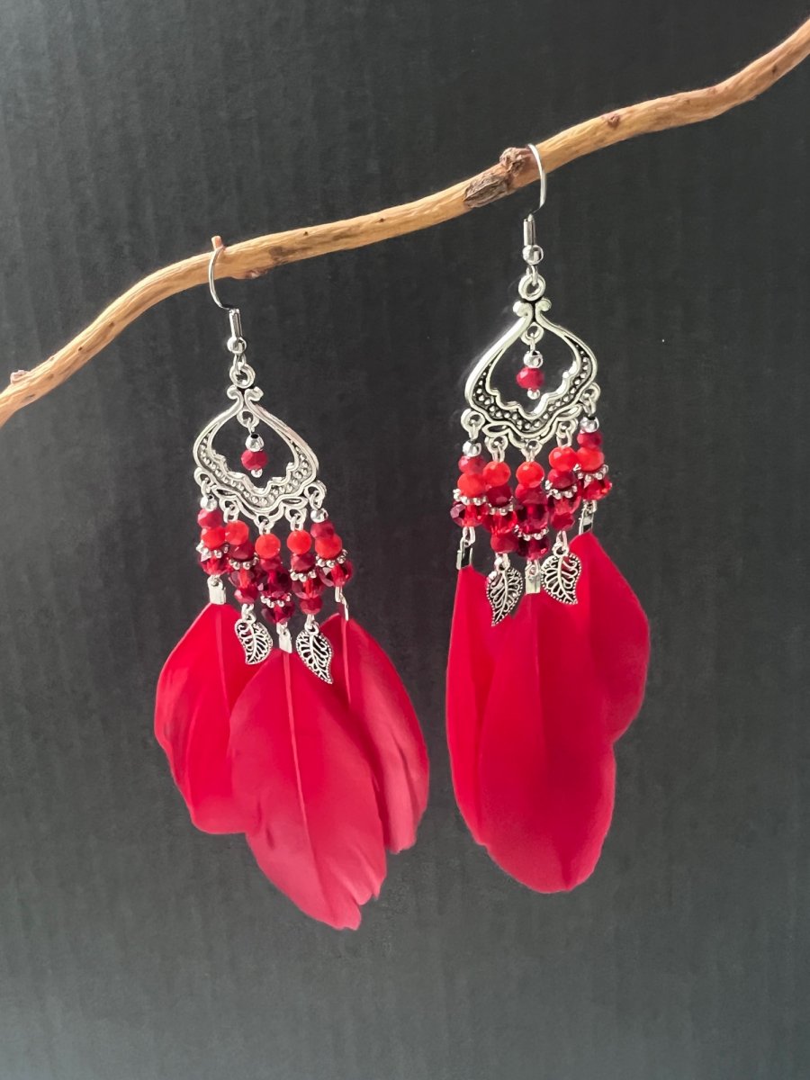 Nepřehlédnutelné "boho" náušnice s červenými peříčky, skleněnými broušenými korálkami a kovovými komponenty v barvě stříbra. Délka od háčku 13 cm. Háček z nerez oceli, ramínko a komponenty v barvě stříbra - běžný kov, gumové zarážky.