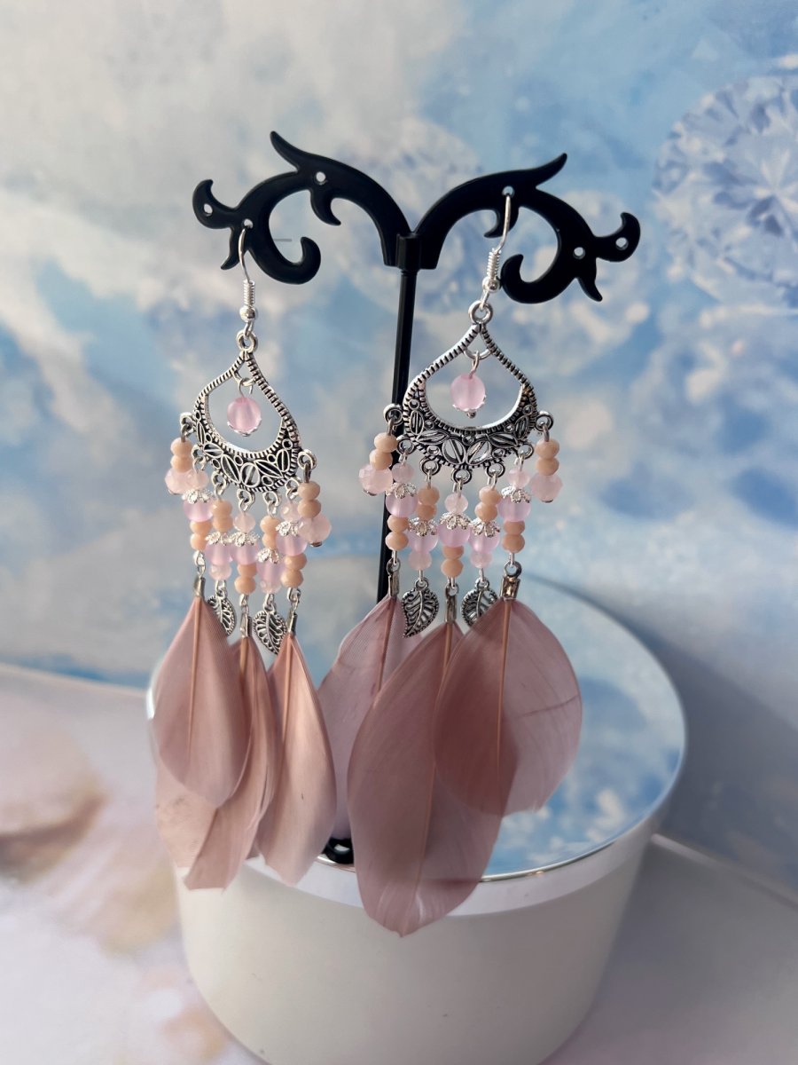 Nepřehlédnutelné "boho" náušnice se pudrovými peříčky, korálkami a kovovými komponenty v barvě stříbra. Délka od háčku 12 cm. Háček, ramínko a komponenty v barvě stříbra - běžný kov, gumové zarážky.