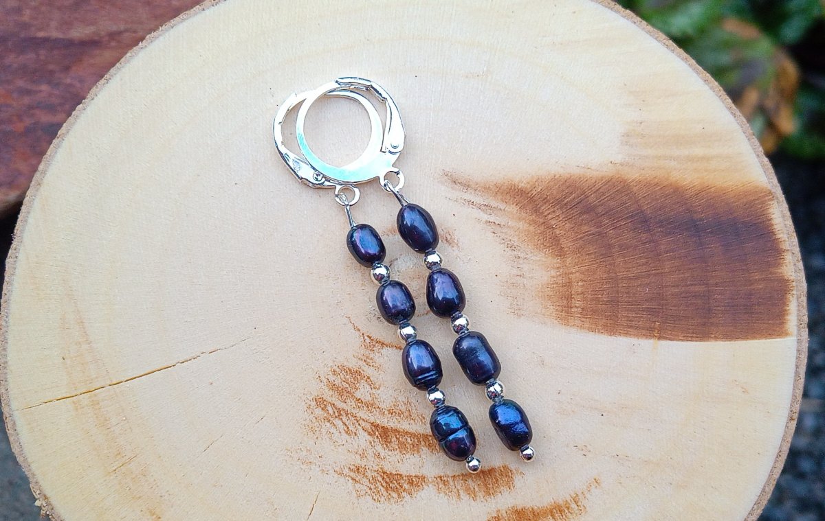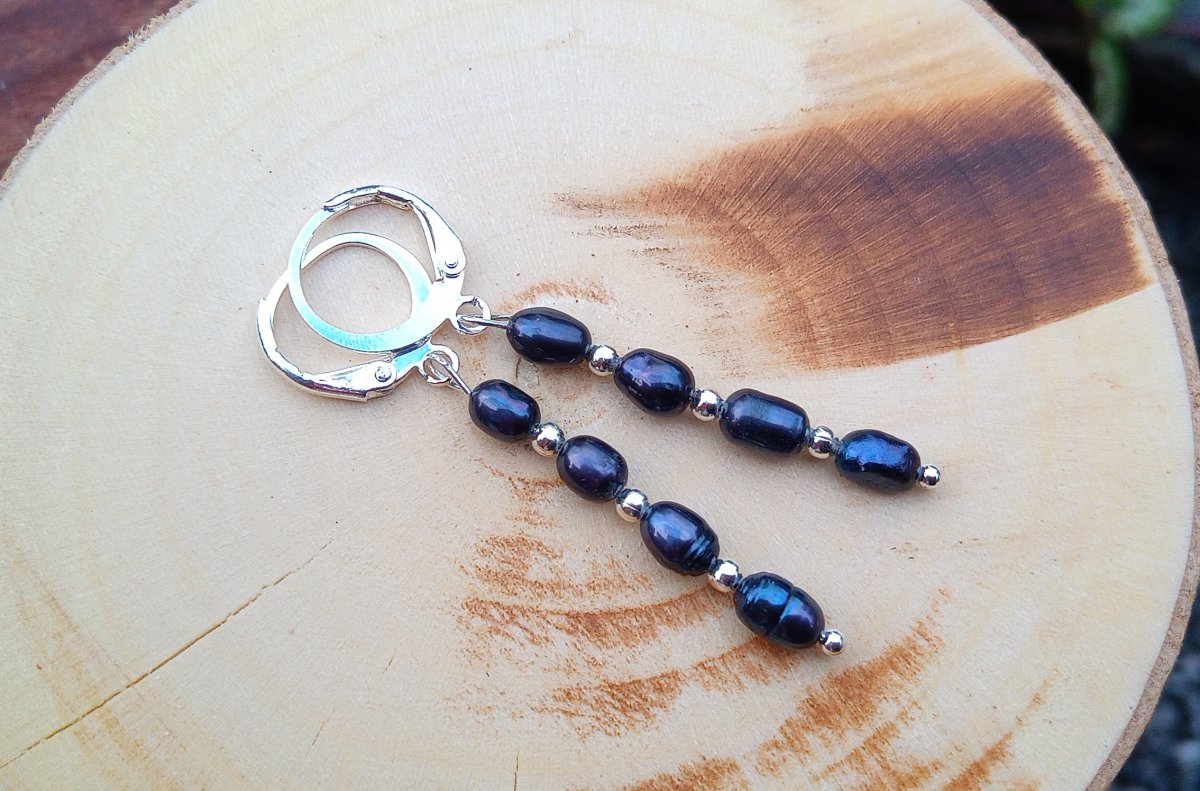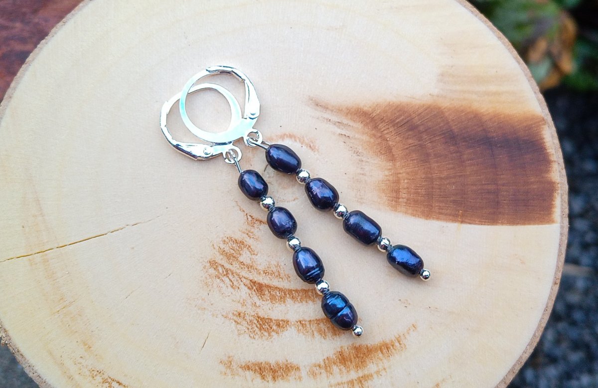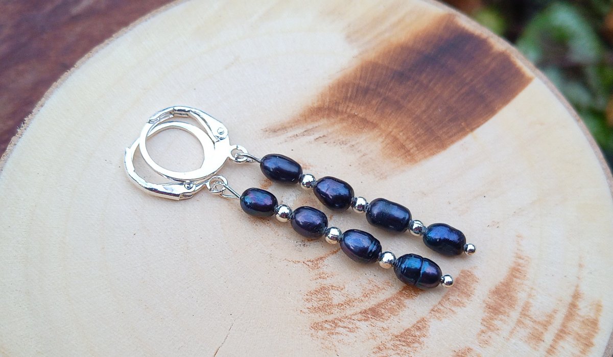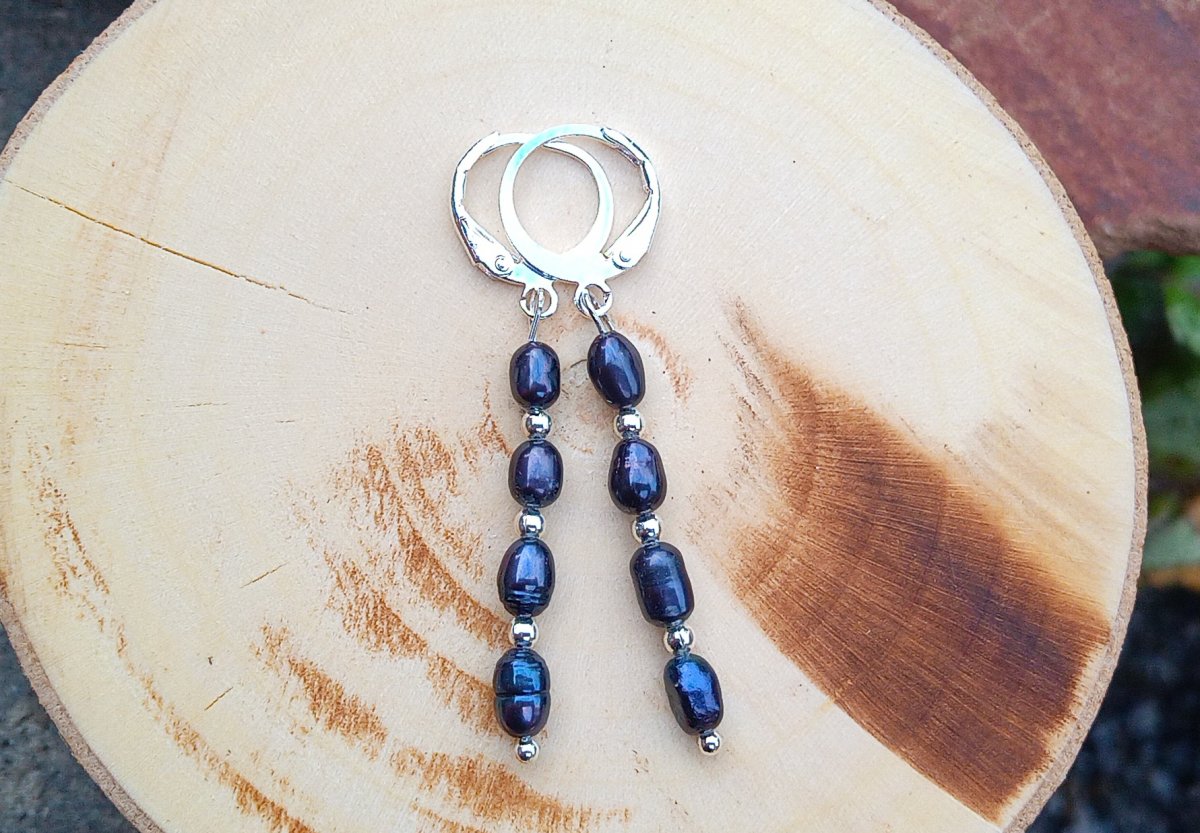 Dokonale lesklé říční perly velké cca 5 mm v tmavě modré barvě oddělené od sebe drobnými stříbrnými korálky v elegantních náušnicích dlouhých 4 cm na zavíracích postříbřených háčcích.